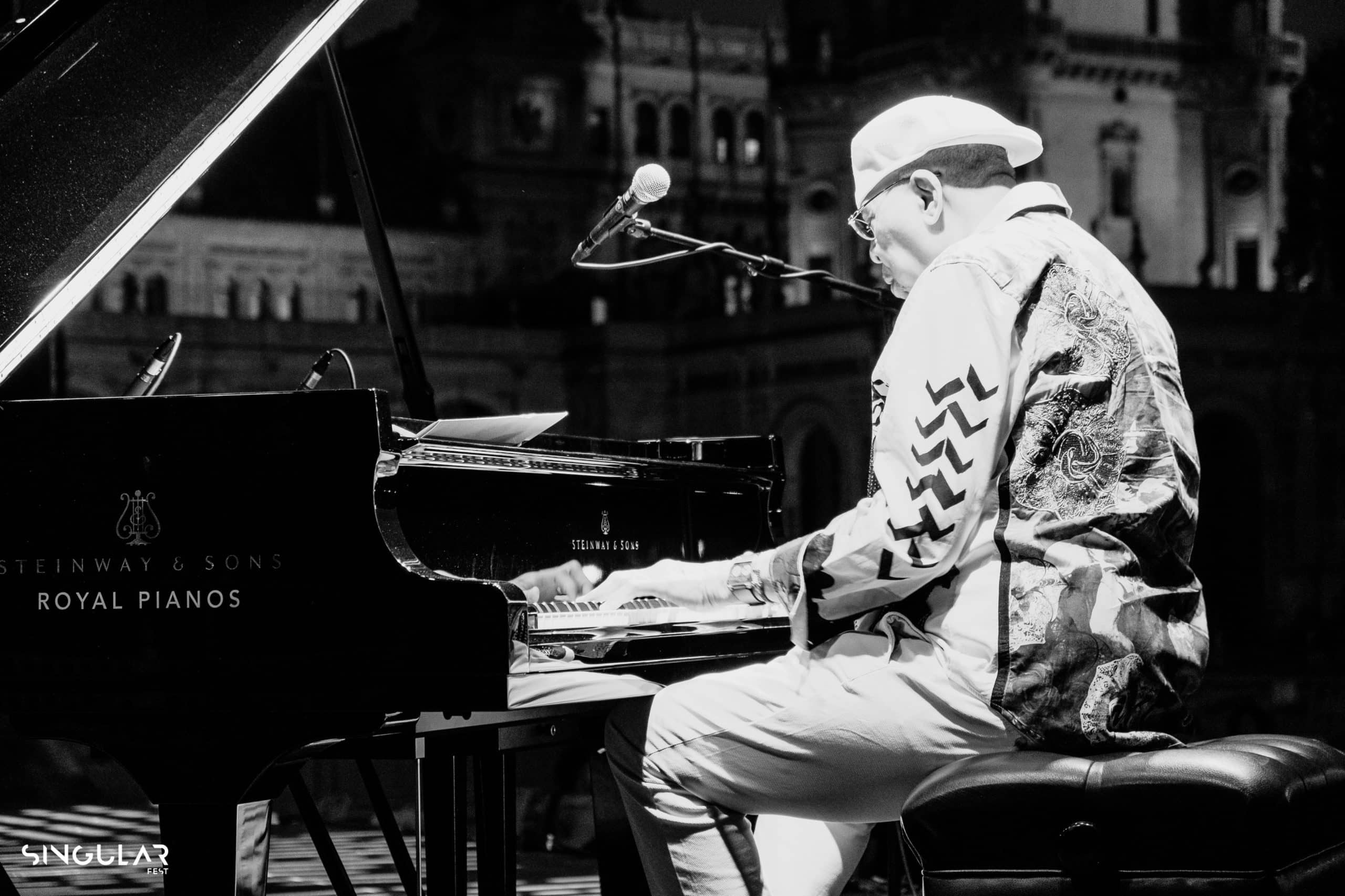 Chucho Valdés había anunciado que el 25 de junio Sevilla iba a ser su primer encuentro con los escenarios europeos después del largo paréntesis impuesto por la pandemia, y que tenía preparado un programa con el que el auditorio “iba a flipar”. Su expresa nostalgia del calor del público coincidió con la inminente liberación de las mascarillas (a las 12 de esa misma noche) y con un aumento de las temperaturas al nivel que suelen tener en estas fechas por estas latitudes: un ambiente de lo más propicio para una noche de viernes animada y cálida en el marco idóneo de la Plaza de España, emblema arquitectónico de la Exposición Iberoamericana de 1929 y escenario de esta tercera edición del Singular Fest.