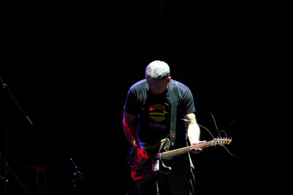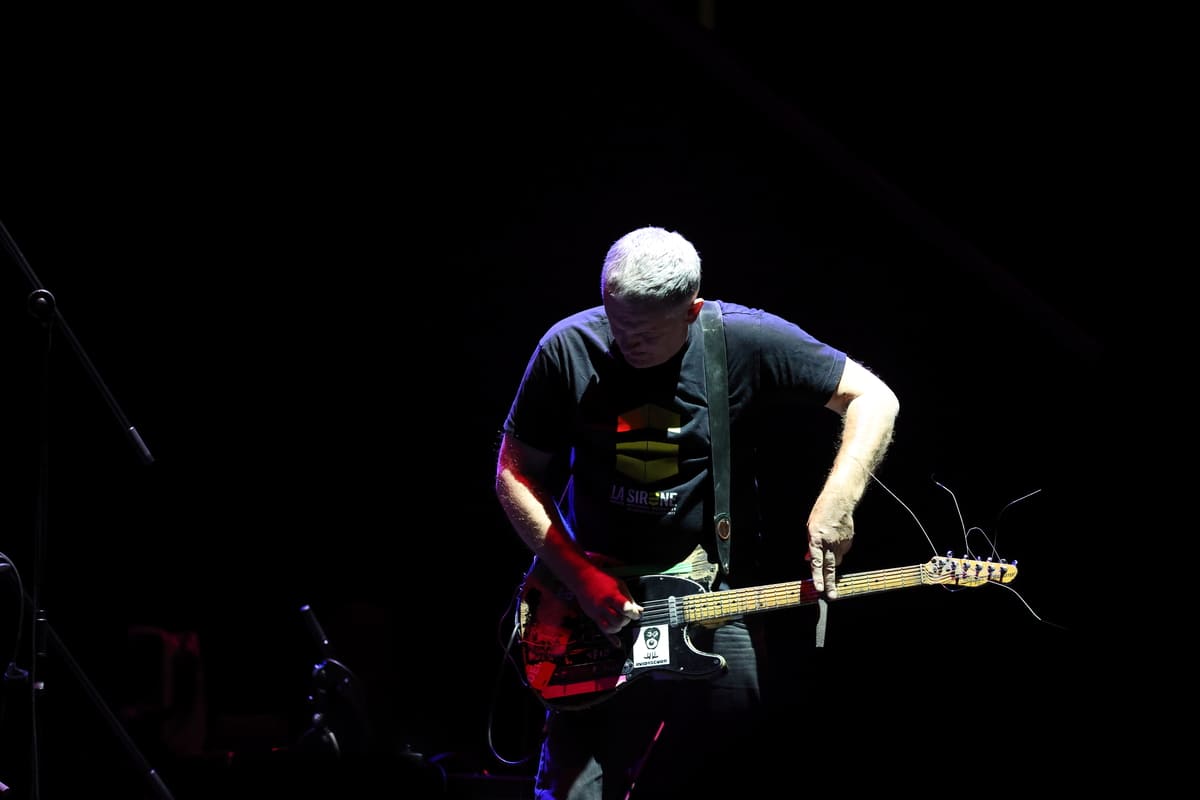 En algunos momentos del concierto ese trance llevaba a Andy Moore a moverse con furia, como electrocutado, su guitarra saboreaba diferentes texturas y complementos: slides, objetos metálicos, golpes al mástil, al cuerpo, contra el suelo, contra el amplificador, moviendo las cuerdas desordenadas que sobresalían del clavijero, un motivo más para la creación de sonidos y texturas. De nuevo, parte del público se levantaba, unos más discretos que otros, para alejarse del caos.  Ese público que se marchaba recordaba de alguna manera a esos heridos de guerra que abandonan el campo de batalla, desmembrados, expulsados por las granadas que se iban lanzando desde el escenario.