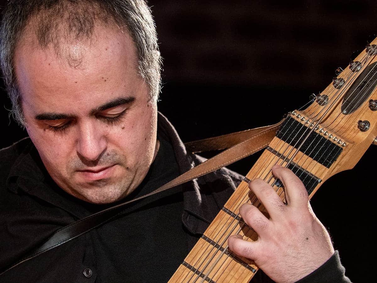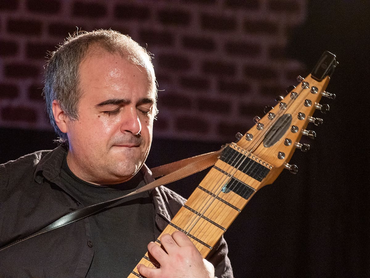 Tomás Merlo Group nos traía una propuesta ciertamente esperanzadora. Crisis, el nuevo álbum del artista, se presentaba por vez primera en este evento. Un retraso propiciado por Filomena y demás sucesos (que hemos prometido no nombrar), conjugó un público deseoso de conocer lo que escondían las nuevas composiciones de Merlo. Resultó ser un proyecto gestado en 2019, cuando Víctor Bobeche, uno de los organizadores, convenció al músico para que grabase su propia música. La historia de Merlo es, decididamente, una historia singular; no hay más que ver el instrumento tan raro que se trae entre manos. El Chapman Stick, artefacto que aúna el bajo y la guitarra en un mismo mástil, fue el primer contacto con la música de Tomás, a los 16 años. Ahora nos presenta un disco a trío con el teclista Jorge Vera y el batería Miguel Lamas (que no pudo asistir a la presentación y fue sustituido por David Fernández para esta ocasión) que integra improvisación, groove y una sonoridad inquietante, aunque divertida.